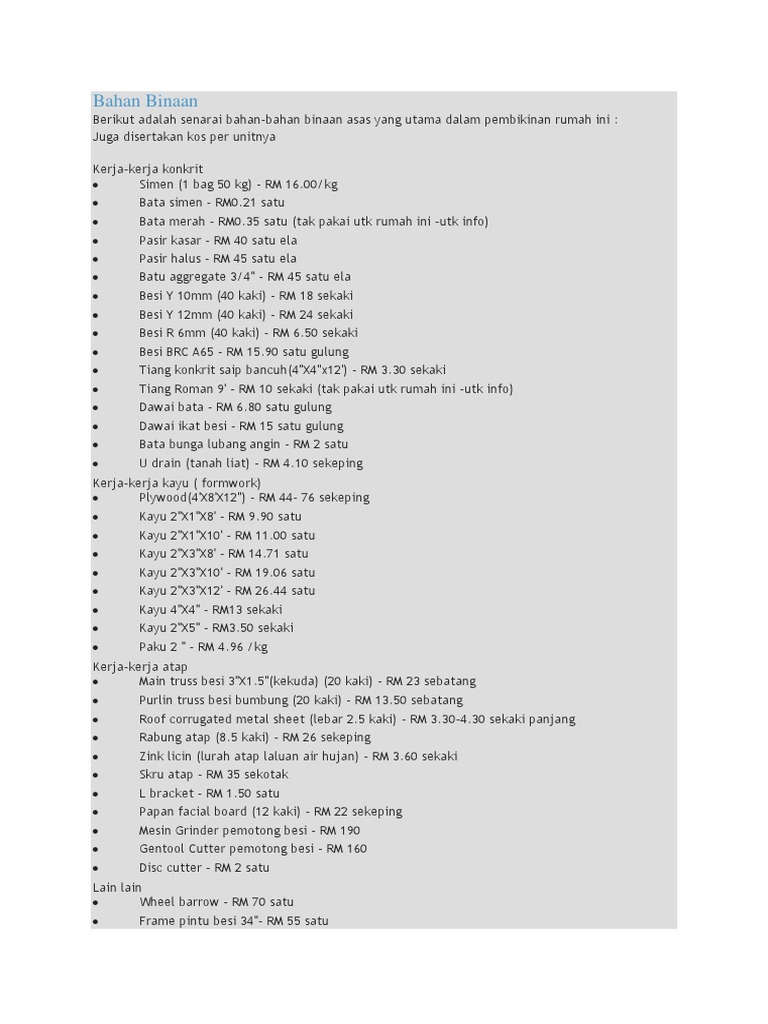 Harga Bahan Binaan 2017 Malaysia Dino Syukl from imgv2-2-f.scribdassets.com Untuk rekod, kos bahan binaan untuk pembinaan projek hartanah meningkat setiap tahun. Objektif muzium negara adalah seperti berikut: Semak anggaran bulanan untuk tempoh klik gambar di bawah untuk download senarai harga. Perlu diingat, bahwa harga bisa berbeda sesuai dengan harga satuan bahan bangunan di tiap daerah. The suggested windscreen coverage value includes the cost. Harga besi hollow di malaysia. Harga besi buruk 2020 selangor dan seluruh semenanjung malaysia. Karena sudah kita ketahui sebelumnya bahwa rumus rab = volume x harga satuan daftar harga bahan bangunan.